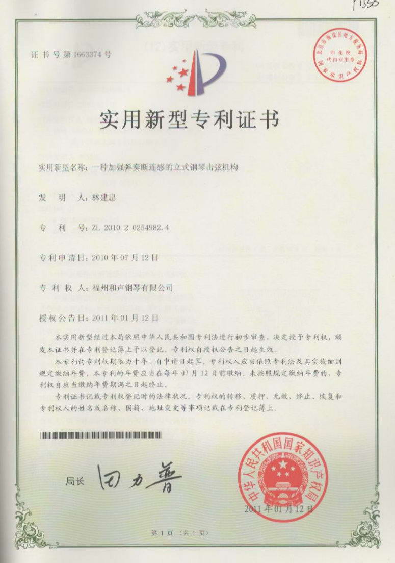 一种加强弹奏断连感的立式钢琴击弦机构(实用新型专利,专利号:ZL 2010 2 0254982.4) 2018-06-28 09:38:54