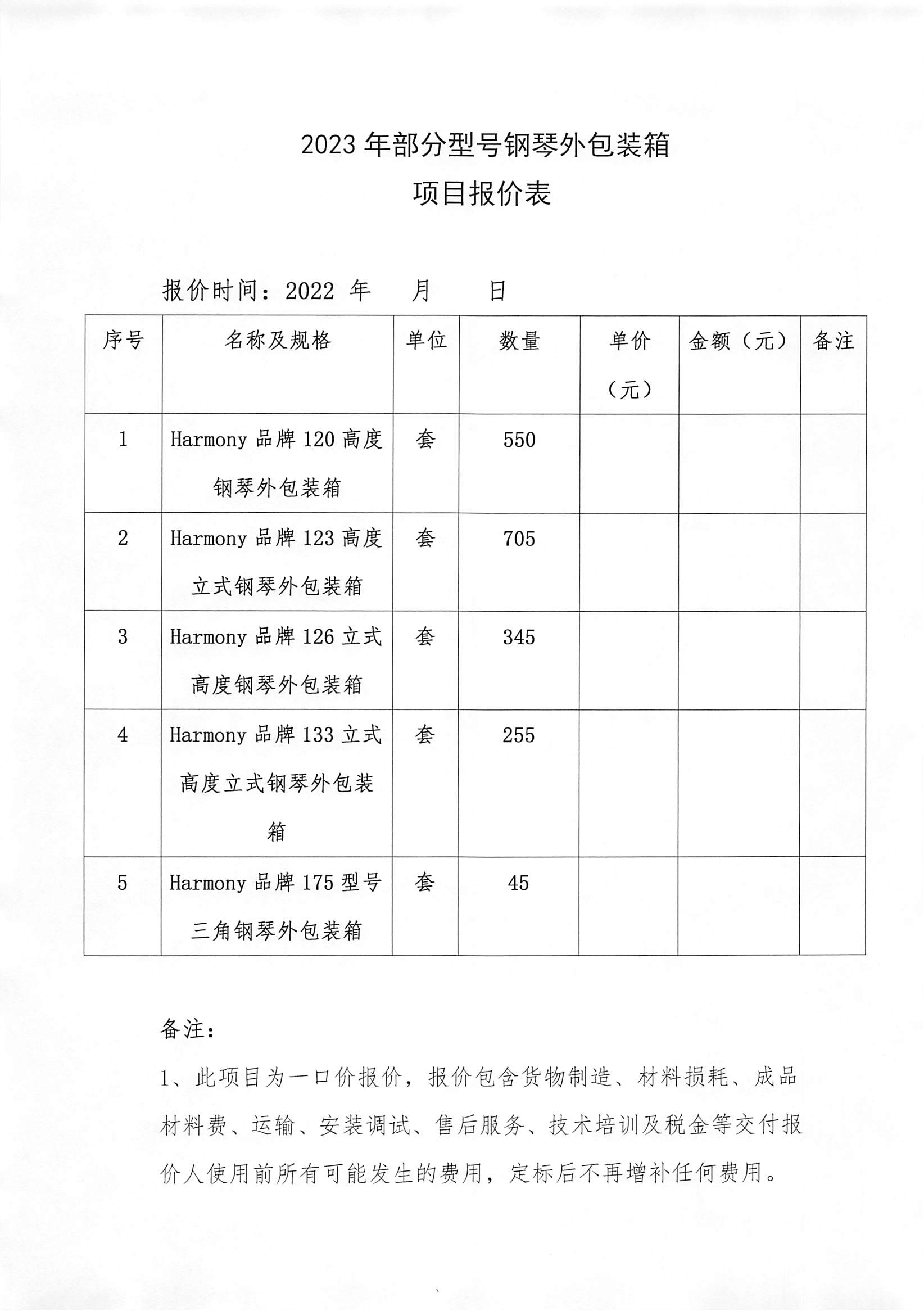 1、请严格按附表“2023年部分型号钢琴外包装箱项目报价表”信息进行报价。