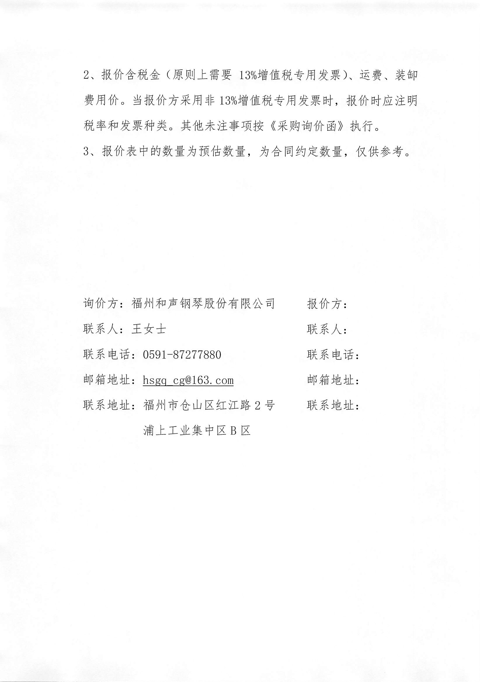 1、询价文件获取方式:报价单位可在福州和声钢琴股份有限公司官网http://m.harmonypiano.cn/)“新闻中心-网站公告”中查阅相关文件,或联系询价联系人获取询价文件,由询价联系人以电子文件形式发送询价文件。