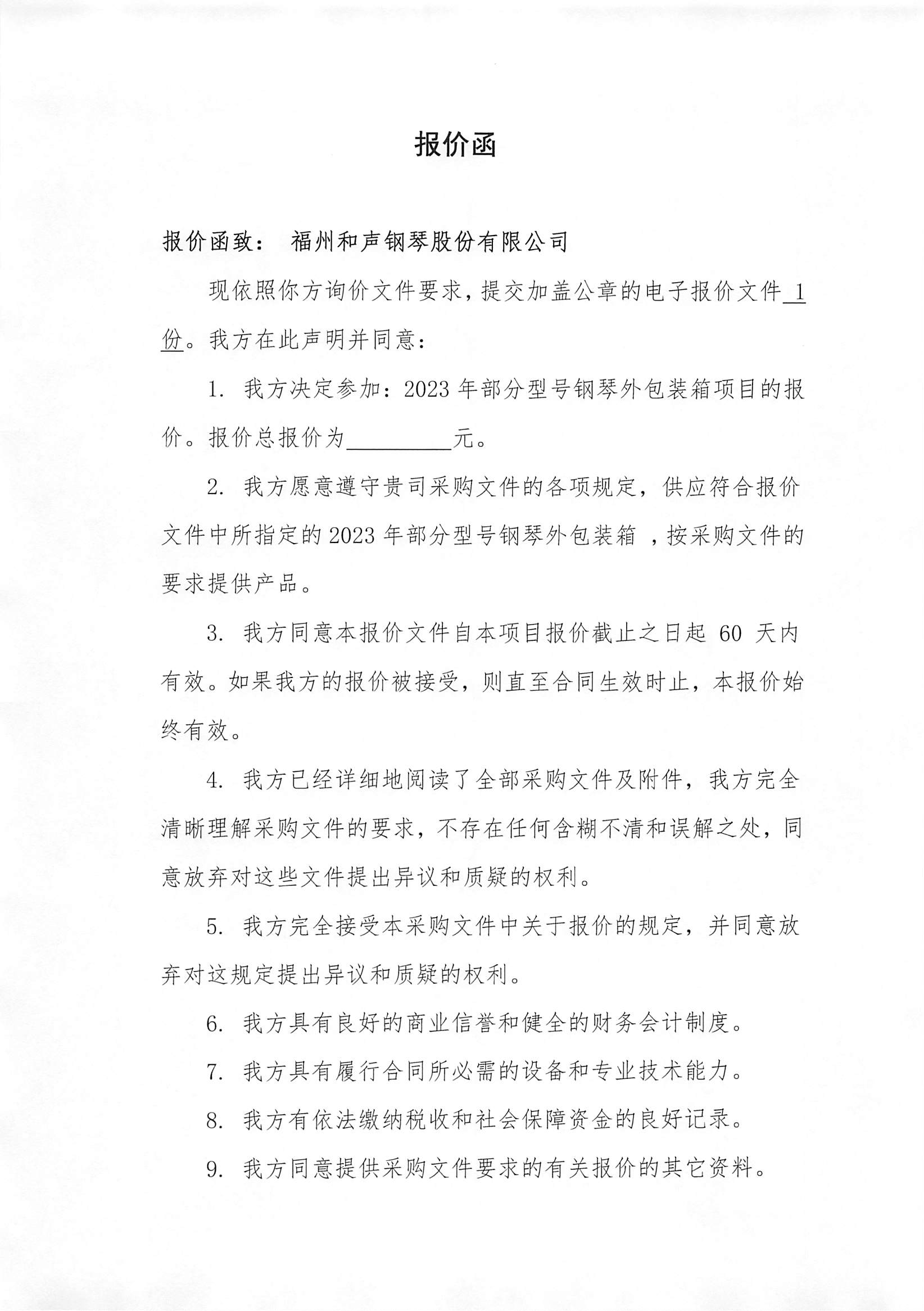 福州和声钢琴股份有限公司 2023年部分型号钢琴外包装箱项目 采购询价公告